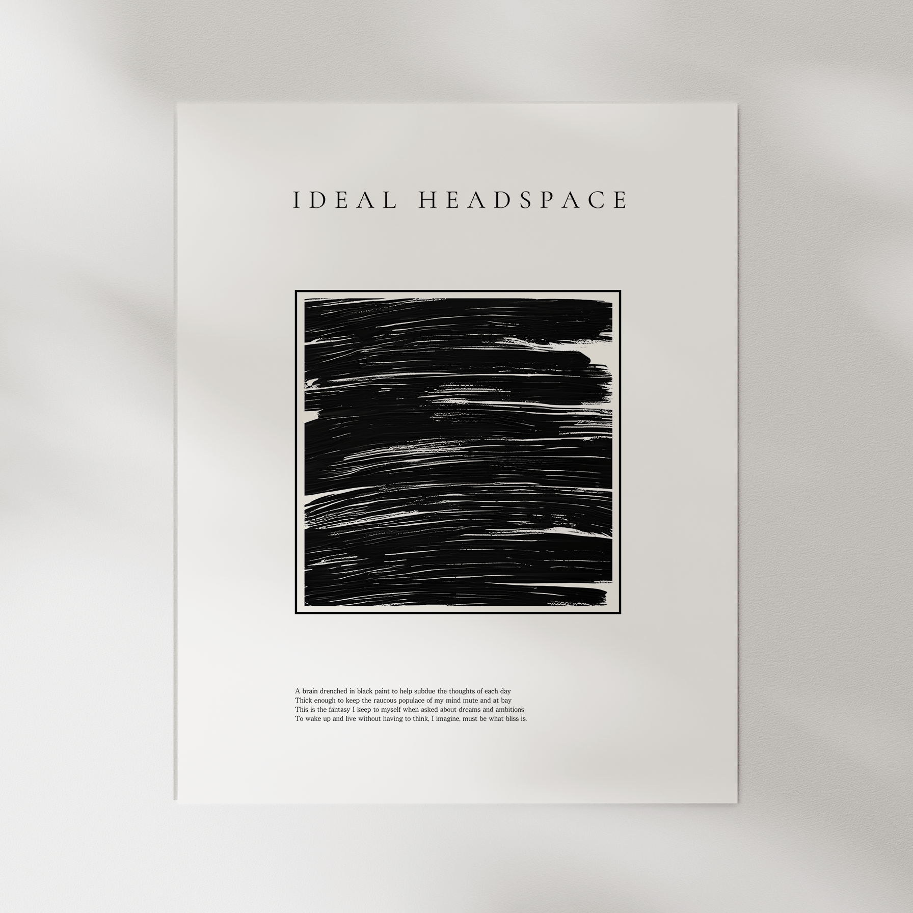 A meditation on the desire for silence, featuring what de la Guerra calls "a sordid idea of bliss being a brain drenched in black paint." Born from discovering how difficult achieving a perfect single brushstroke actually is.